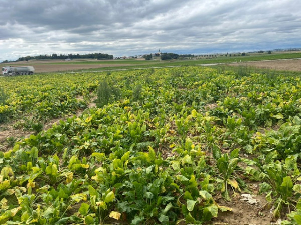 - Viele Flächen wurden mehrmals mit Insektiziden und in Kombi mit Karrikin behandelt. Was man deutlich sieht, ist, dass die Schläge und die Zuckerrüben insgesamt länger durchgehalten haben. Die Frage ist aber auch, haben wir im Raum Ingolstadt eventuell eine „zweite Welle“ von Zikaden übersehen die Anfang August noch kam? Oder zeichnen die Zuckerrüben in der Region erst so spät. Das ist hier die Frage, auch hier ein Bild von einem Zuckerrübenschlag, der in dieser Zeit nochmals mit Karrikin behandelt wurde. Zusätzlich haben wir hier noch ein neues Kupfer-Produkt, Intus eingesetzt. Intus ist ein Kupferprodukt das nicht nur eine Kontaktwirkung hat, sondern das Kupfer geht ins Blatt hinein. Vielleicht könnte uns dies helfen in Zukunft sicherer in diesen Regionen Zuckerrüben und Kartoffeln zu produzieren. Viele positive Ergebnisse kommen hier auch aus dem Bioanbau.