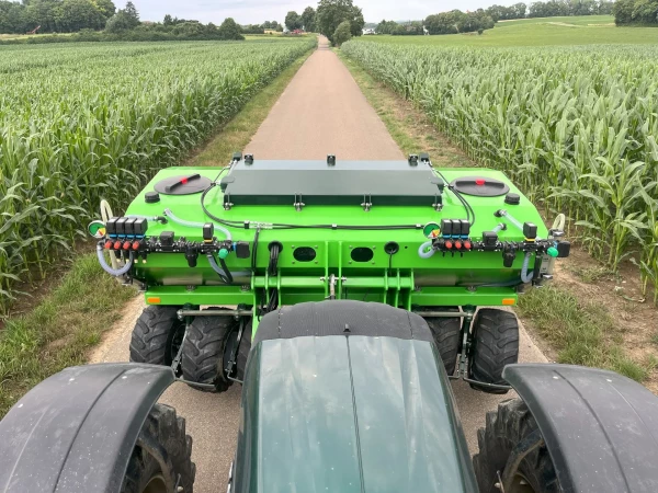 In der Mitte einen Düngertank für Mineraldünger. ISOBUS gesteuert mit einem zentralen Dosierer mit jeweils einem Dosierer je Reihe. Die vier Düngerschläuche werden unterm Schlepper durchgeführt und sind immer ansteigend bis zum Düngerschar. Es gibt somit keine Schlauchbögen, in denen der Dünger liegen bleibt und beim Wendevorgang das Vorbeet ständig nachgestreut wird. Wir brauchen weder Verteilerköpfe noch Zyklone. Der Dünger, inklusive Staub und Abrieb, wird in den Boden geblasen.